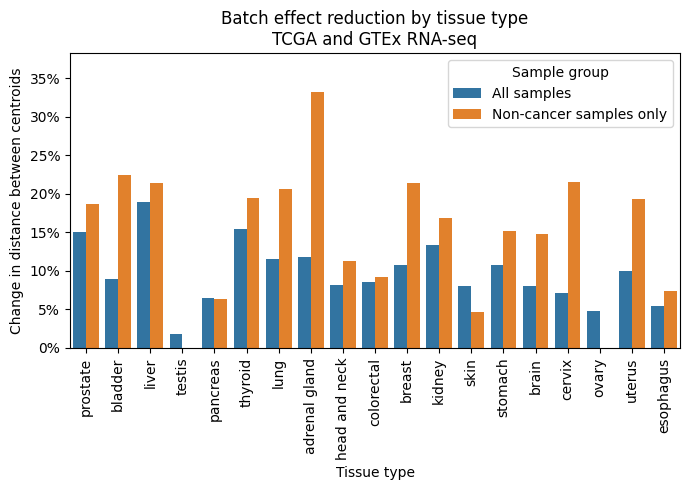 In every matched organ, re-processing TCGA and GTEx RNA-seq samples with a consistent bioinformatics pipeline reduced the batch effects. The reduction was almost always larger when considering only non-tumor samples.