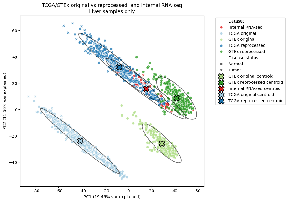 I looked at groups of samples from matched organs from the different datasets to quantify the batch effects before and after re-processing. For GTEx, nTPM (normalized transcripts per million) normalization was done across the entire collection. For TCGA, normalization was done per-project. PCA was calculated for all samples from a matched organ. The centroid of the points from each dataset was estimated in 2D or Nd space, and the euclidean distance between centroids was calculated. A distance was also calculated using only non-tumor samples in TCGA, which were expected to be closer in PC-space to the GTEx samples. All of these results are before running any batch correction algorithm, like COMBAT.
