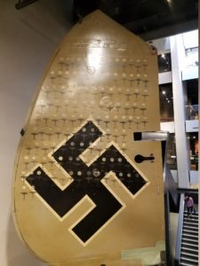 The tail fin from Heinz Schnaufer’s Bf110 fighter. The most successful German night pilot in the war, he shot down 121 British bombers and was responsible for 850 RAF casualties.